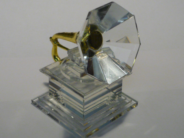 M-215g Glass Miniature Phono. 3 5/8″ H x 2 1/4″ square base, as shown in photos. No markings. Cute. Age not known.