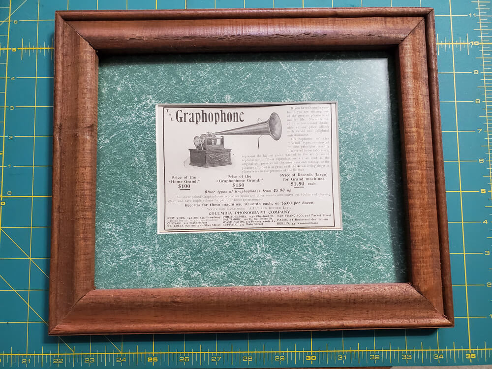 M-495 “Home Grand” Advertisement, Framed. Original advertisement (4″ x 5.5″) from January 1900 in a wood frame (10″ x 12″) with a glass front. The Columbia “Home Grand” {Model HG, First Style] was introduced in 1899 and was priced at $100. This item comes from a collection and is ready to display or hang.